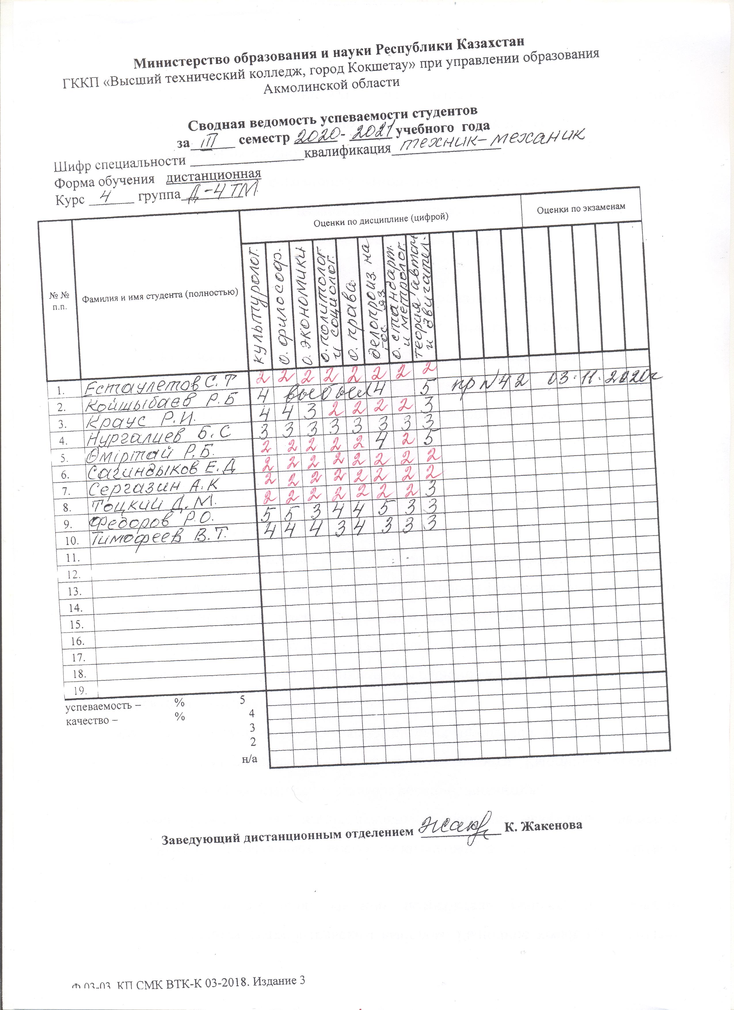 Сводная ведомость группы Д-4 ТМ