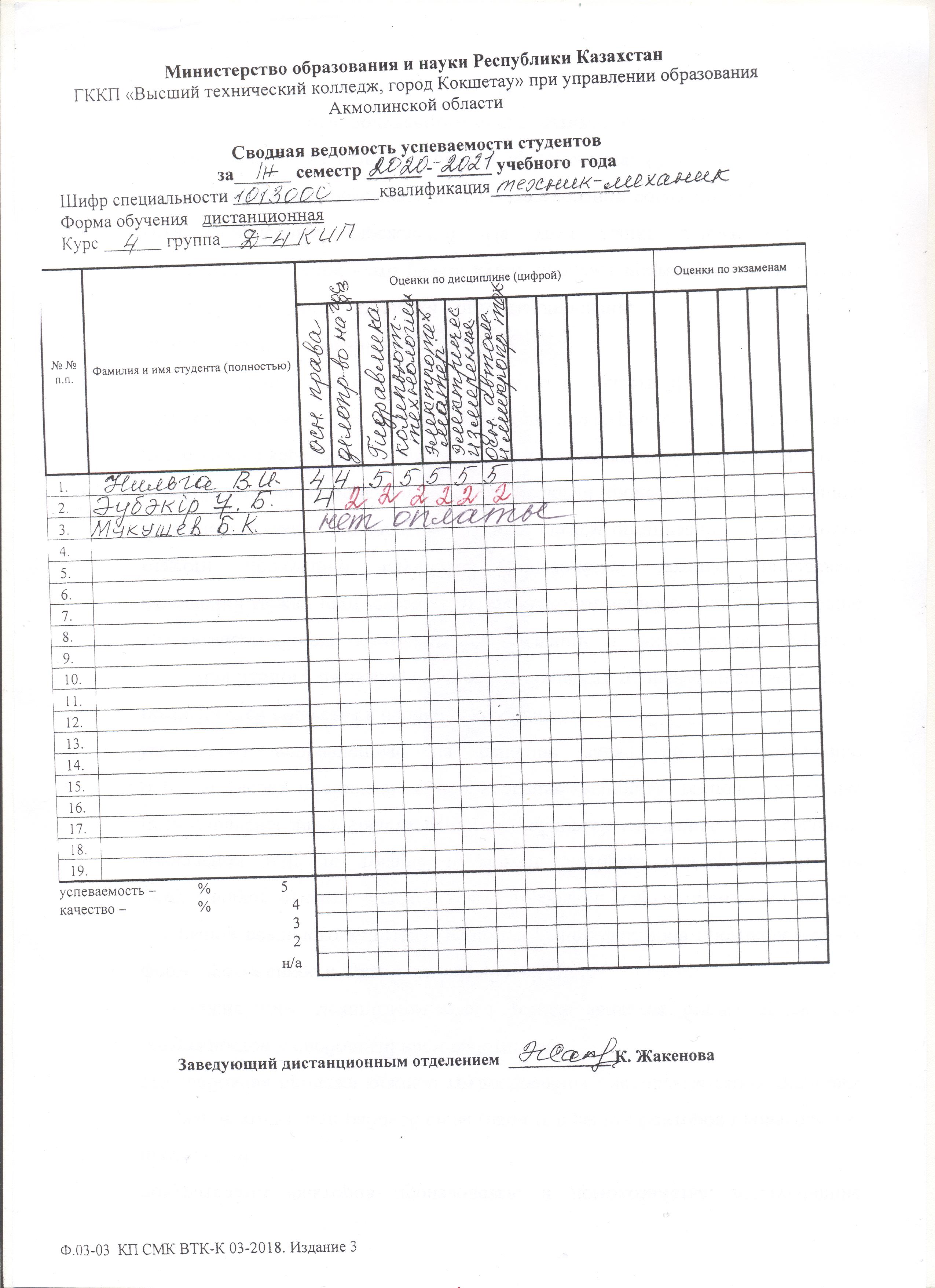 Заочное отделениеУрокиСводная ведомость группы Д-4 КИП